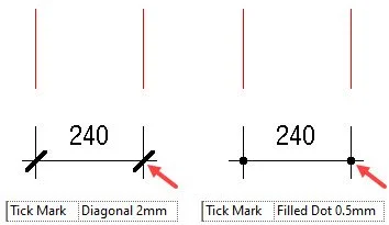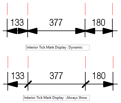 The Interior Tick Mark appears whenever you have three or more witness lines. The extremities use the Tick Mark option, while the interior references use the Interior Tick Mark.